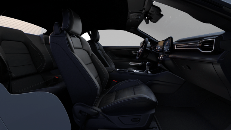The exterior of this Mustang is dressed in a stunning Blue hue, complemented by the sleek and aerodynamic styling that has made the Mustang an icon. Step inside, and you'll be greeted by a premium cabin adorned with leather-trimmed bucket seats, a heated steering wheel, and a state-of-the-art Magnesium Framed Panoramic Curved Display that seamlessly integrates your infotainment and vehicle controls.