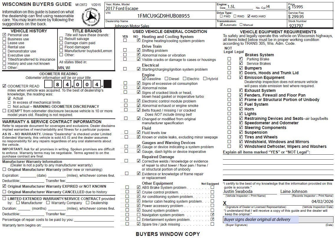 KBB.com 10 Best Used Compact SUVs Under $15,000. Only 84,004 Miles! Delivers 28 Highway MPG and 22 City MPG! This Ford Escape boasts a 1.5L I4 engine powering this Automatic transmission. ENGINE: 1.5L ECOBOOST -inc: auto start-stop technology (STD), Wireless Phone Connectivity, Wheels: 17 Sparkle Silver Painted Aluminum.