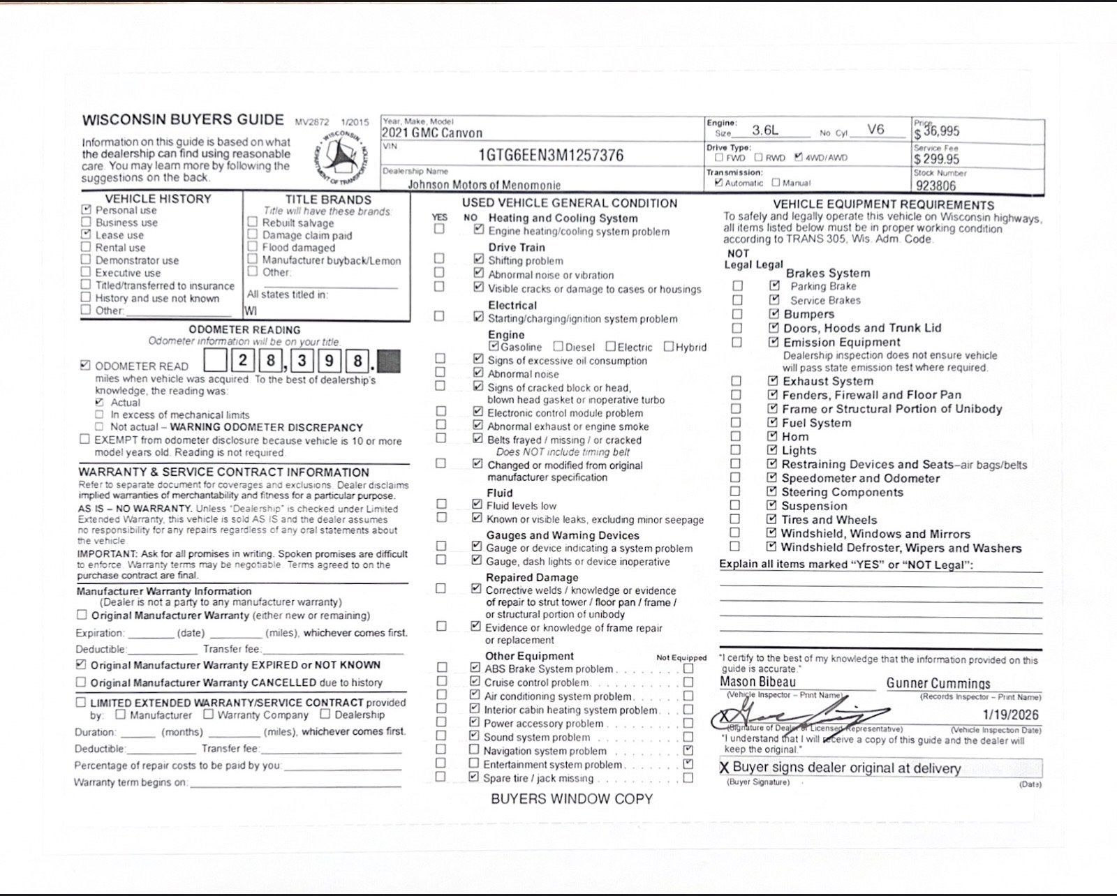 Price does not include sales tax, title, registration, or $299.95 service fee.