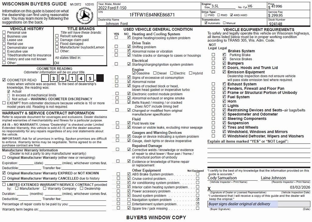 At Johnson Ford, every vehicle is market-priced daily using live third-party data across Wisconsin and Minnesota to ensure fair, competitive, upfront pricing. Our inventory includes a wide selection of used cars, used trucks, and used SUVs for sale, with a strong focus on popular Ford models such as the Ford F-150, Ford Explorer, Ford Escape, Ford Edge, Ford Ranger, and Ford Bronco, along with other trusted makes and models. Every vehicle is professionally inspected and fully reconditioned, and we proudly offer Ford Certified Pre-Owned vehicles, giving buyers added peace of mind with factory backed standards. Whether you’re shopping for AWD SUVs, capable 4x4 trucks, or reliable used vehicles priced under $15,000–$20,000, you can buy with confidence.